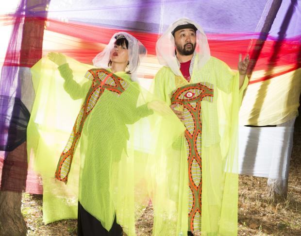 The Germany based Japanese duo WaqWaq Kingdom are Shigeru Ishihara (DJ Scotch Egg/Seefeel) and Kiki Hitomi (King Midas Sound). They describe their music as “minyo footwork” – minyo being the Japanese translation of Volkslied (German for people’s song) – combining imagery from Japanese mythology with Jamaican dancehall, 8-bit techno, African polyrhythms and electronic music.