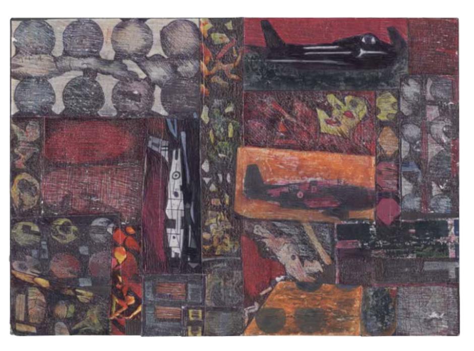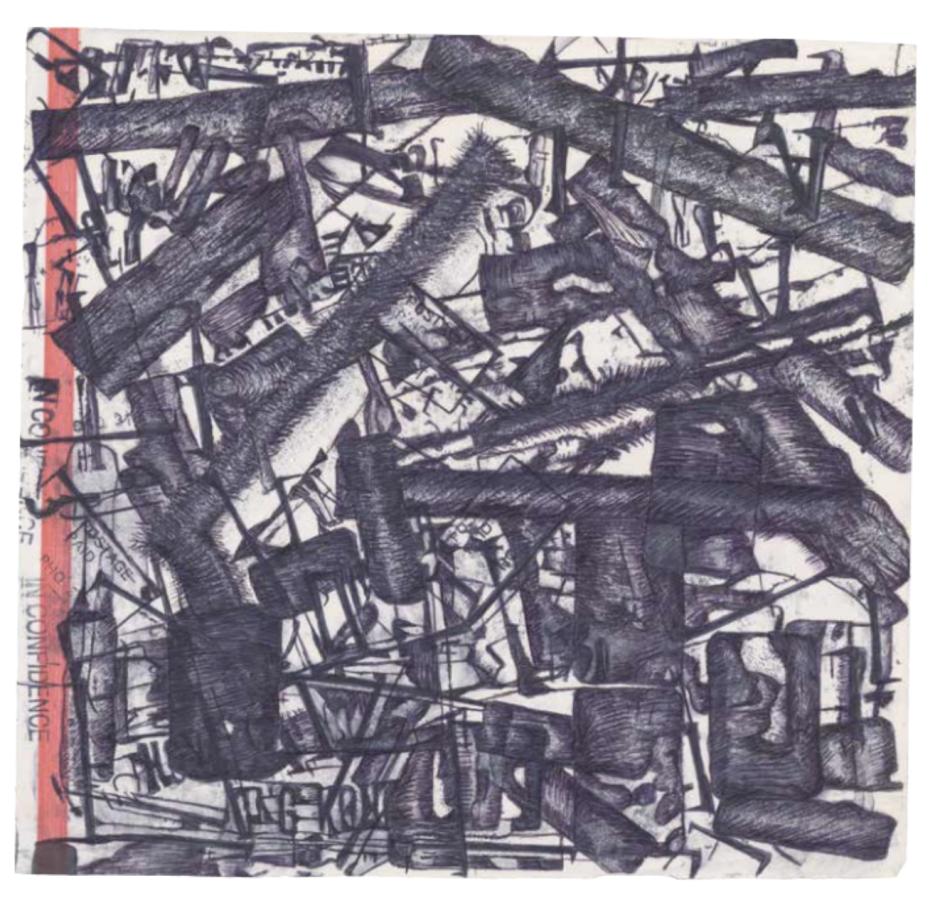 “I worked in an office for a long time so I used to do some work on collages during lunch breaks and slack times using office materials,” he told Daniel Spicer in 2014 in The Wire 368. “I like different types of pens like biros and felt tip and indelible marker and fluorescent marker pens. And, of course, there’s all the different types of paper you can use.”