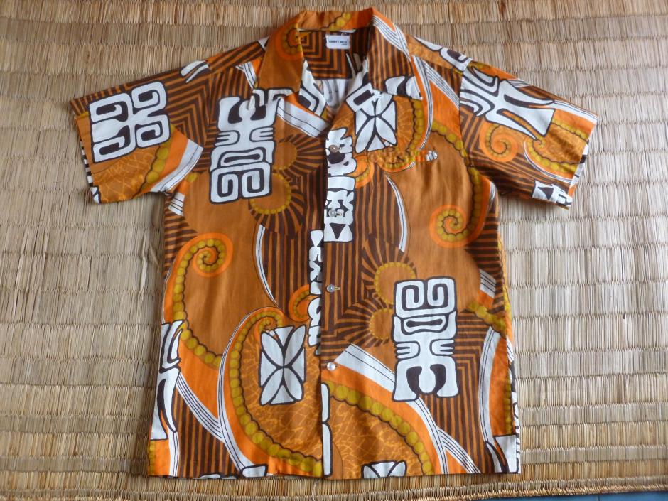 In our local flea market in Rome my partner spotted a bag which seemed full of colourful shirts. She bought it for a few Euro. It turned out to contain several Hawaiian and Tiki shirts from the 1960s, probably used in a film. Some still had laundry tags on them. This is a real Martin Denny style Tiki shirt.